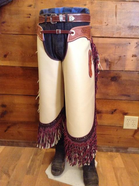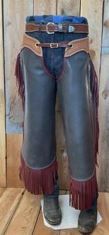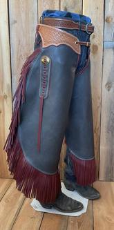 To the right, dark grey chinks with maroon fringe. 29 1/2" long with 7" fringe. Waist 35" - 43", thigh 24" - 28". 5 ounce chap leather. $400